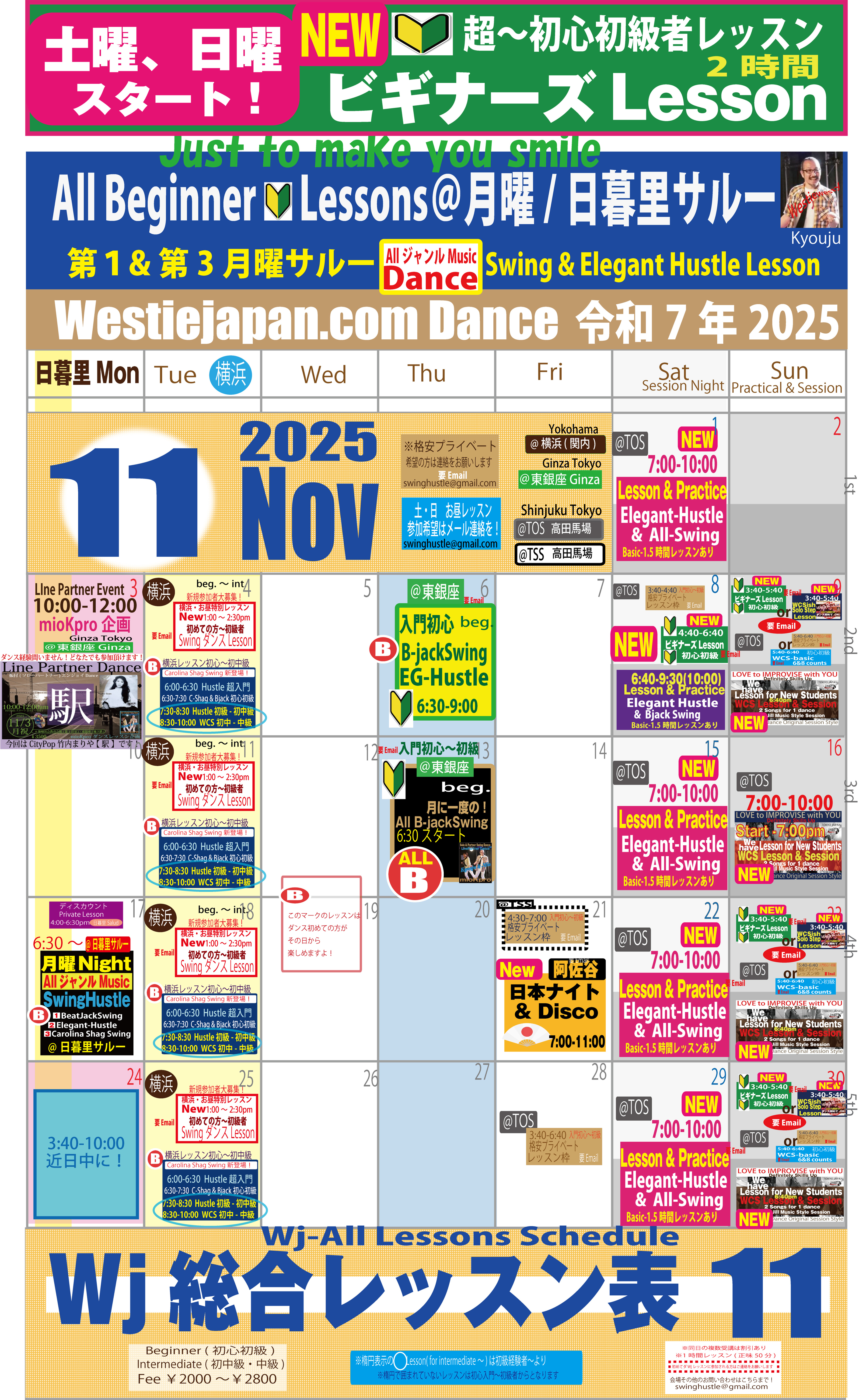 ◆Wjスケジュールには、現在4種のダンスレッスン+特別レッスン+イベント等が表示されています。
