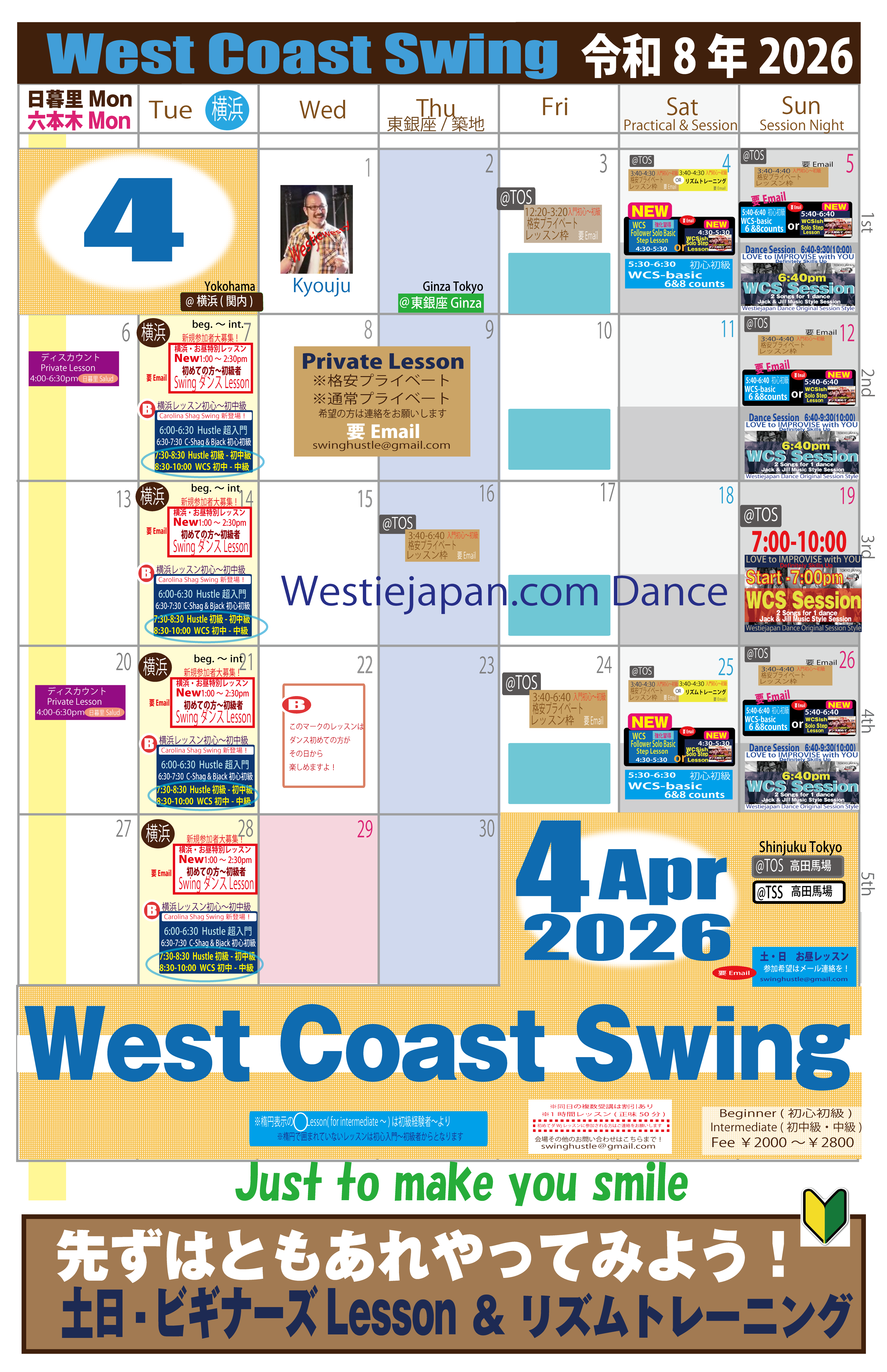 東京都内各所■初心初級 WCS Lesson For Beginners・1時間/¥2000・1.3~1.5時間¥2500 ■■中級 WCSLesson For Intermediate・ 1.2~1.5時間¥2500~¥2700 ■■火曜日・横浜 WCS初中級~中級レッスン 8:30-10:00pm ¥2700 <問い合わせ> swinghustle@gmail.com ページトップへ!